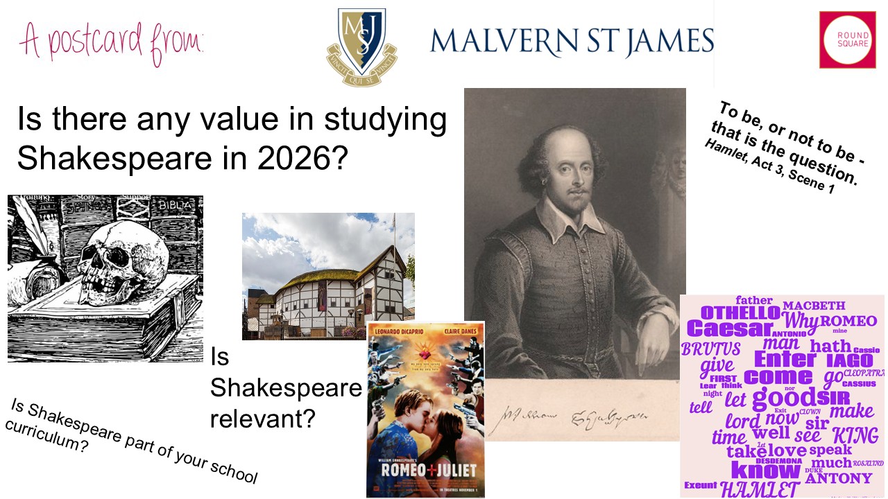 Malvern St. James School invites you to register up to six students aged 13-15 and one adult HERE for a RS Zoom Postcard on 22 April with the theme “Is there any value in studying Shakespeare in 2026?”