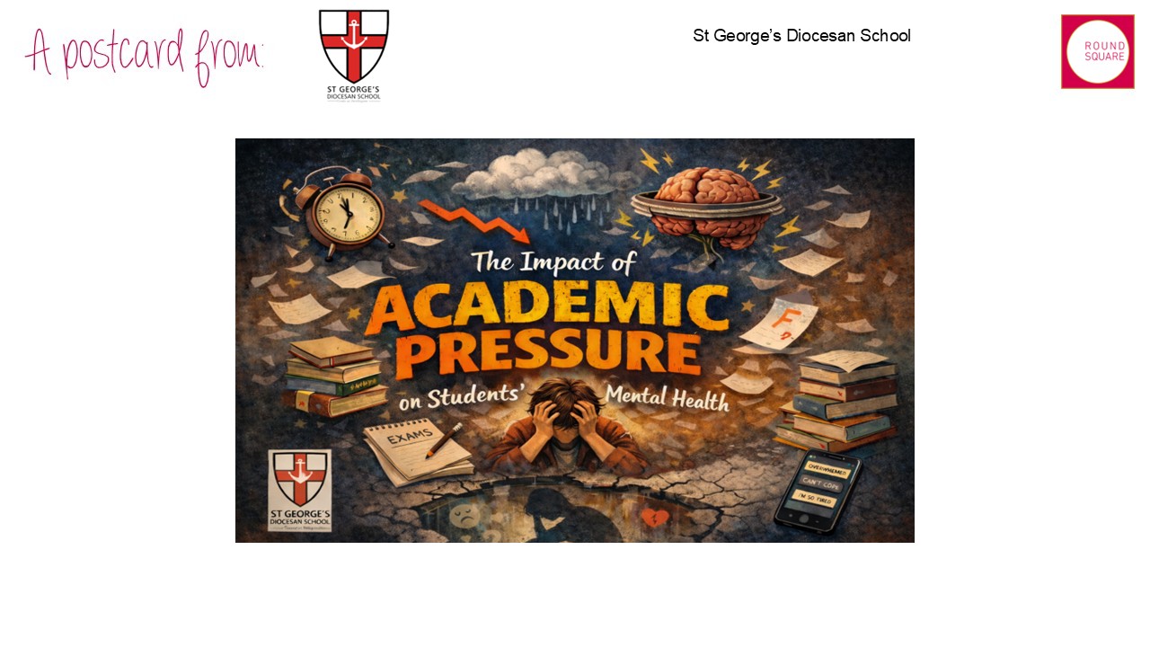 St. George’s Diocesan School invites you to register up to six students aged 16 – 18  and one adult HERE for a RS Zoom Postcard on 6 May with the theme “How academic pressure affects students’ mental health”